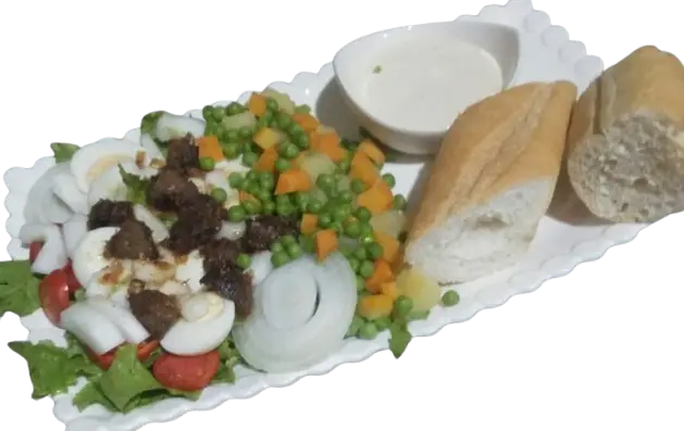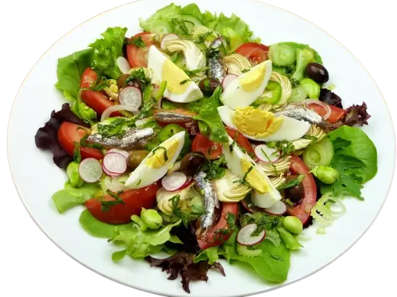 Feuille de laitue, tomate, oignons, concombre, oeuf, pomme de terre. Servire avec vinaigrette au citron.